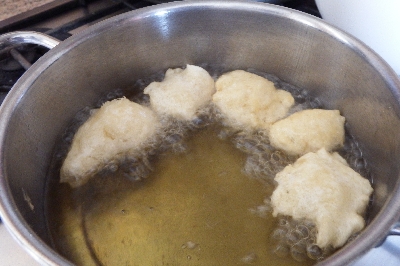 Heat the peanut oil in the saucepan with high edges. Moisten the teaspoon with some oil, scoop the dough and let it slide into the hot oil. Cook the dough balls until they are puffed and golden