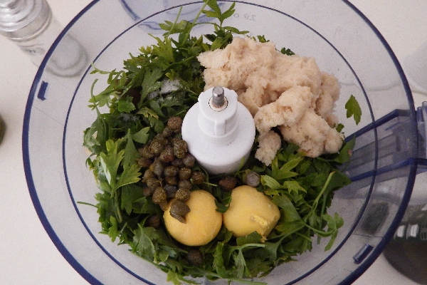 Put the parsley, half garlic clove, egg yolks, anchovy, well-squeezed bread crumbs, capers, and a pinch of salt and pepper into the food processor.