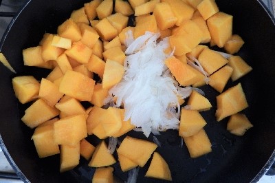 Slice the onion thinly. Cut the pumpkin into cubes and place it in the saucepan with a drizzle of extra virgin olive oil and a sprig of rosemary, and sauté over high heat. Add a glass of water and cook covered with the lid until tender. Season with salt and pepper, remove the sprig of rosemary