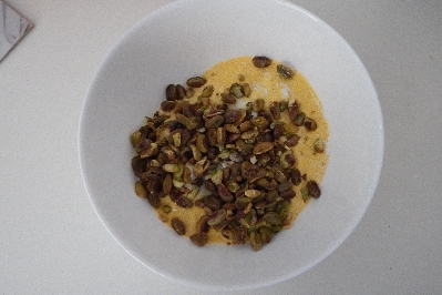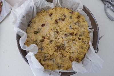 Line an 8-inch diameter cake pan with parchment paper. Place the crumble mixture inside, sprinkle the surface with the tablespoon of granulated sugar and pistachios.