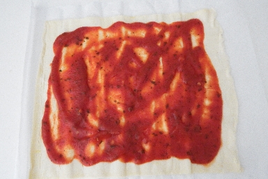 Unroll the puff pastry sheet onto a sheet of parchment paper. Spread the tomato sauce keeping the edges free