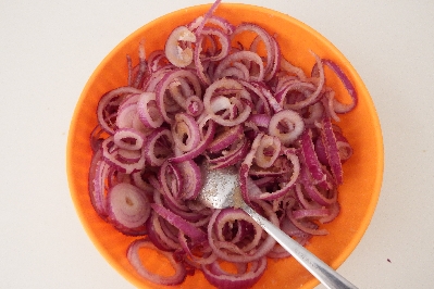 First, peel the onions, wash them, dry them, and slice thinly