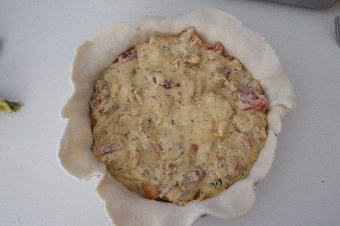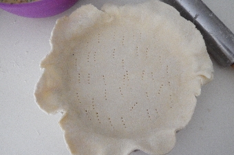 Line a 9.5-inch diameter pie pan with a sheet of parchment paper slightly moistened with water and squeezed. Unroll the shortcrust pastry on top and prick the base with a fork.