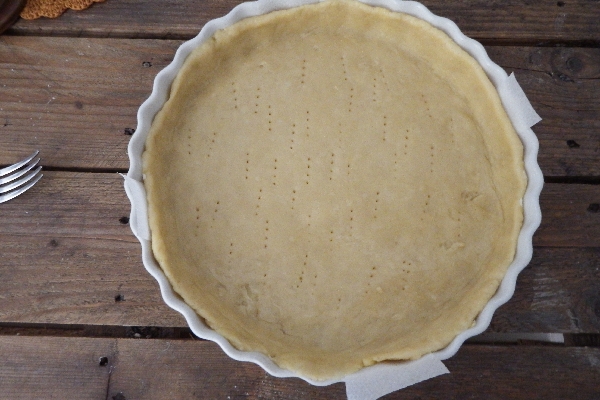 Grease a 9-inch diameter baking pan and place two strips of parchment paper forming a cross, letting the paper come out from the edges. This is a fantastic way to easily extract the savory tart once it is ready. Place the wine pastry inside it, making sure it adheres well along the edges with your fingertips, and prick the base with the tines of a fork