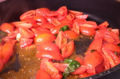 Wash the cherry tomatoes under running water and cut in half. Cook the spaghetti, meanwhile in another pan pour a drizzle of extra virgin olive oil with the clove of garlic. Add the cherry tomatoes and continue cooking for a few moments. Season with the basil leaves broken into pieces.