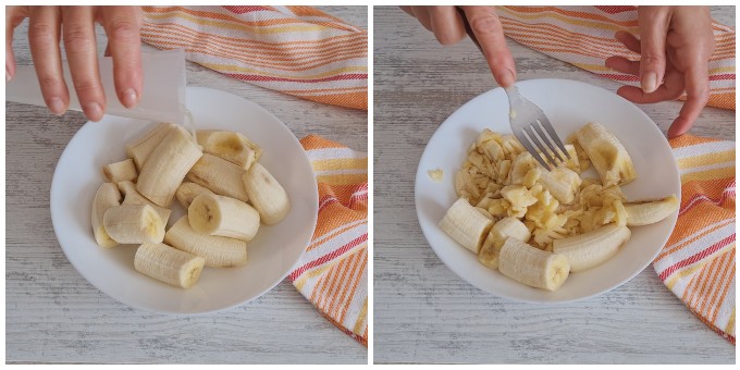 Peel the bananas, cut them into pieces, and drizzle them with the juice of 1/2 lemon, then mash the bananas with the tines of a fork.