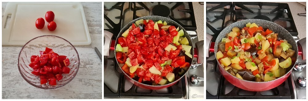 Meanwhile, wash the tomatoes, cut them into pieces and, after 10 minutes, add them to the skillet. Salt, add basil, stir, and continue cooking for about 15 minutes until all the vegetables are cooked.
