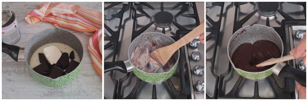 Pour the sweetened condensed milk into a small saucepan, add the chocolate and the butter.