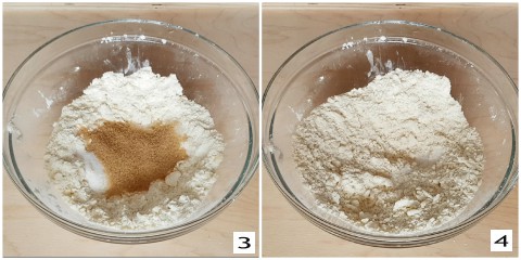 Place the flour in a bowl (I mix it a bit with a whisk instead of sifting it), add the lard (1), and work by rubbing the palms of your hands with the flour and lard until fully absorbed (2).