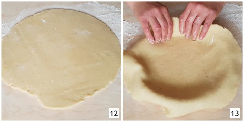On the floured work surface, roll out the shortcrust pastry into a disc about 1/4 inch thick (12), then lift the rolled pastry and position it in the pan (13).