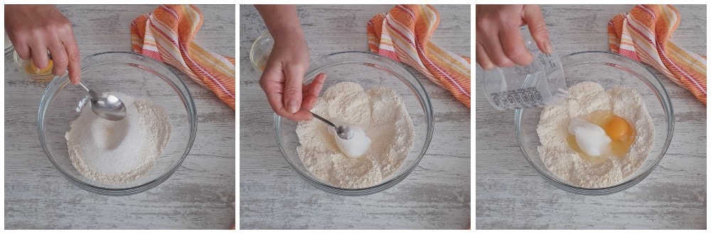 • Mix the semolina flour, all-purpose flour, and sugar in a bowl.