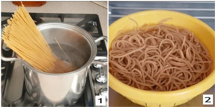 Place a pot with plenty of water on the heat. As soon as the water reaches a boil, add a pinch of salt, drop in the whole wheat spaghetti and cook them for the time indicated on the package (1). Once cooked, drain them and let them cool slightly (2).