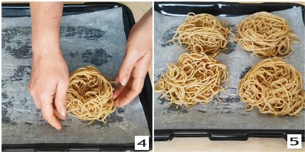 Take back the now lukewarm or cold spaghetti and form 4 nests, placing them on the baking sheet (4 – 5).