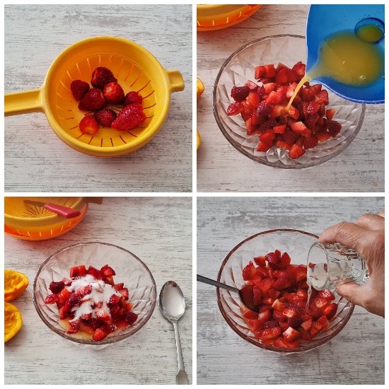 Place the strawberries in a colander and wash them under running water; let them drain for a few moments. Remove the stem, cut the strawberries into pieces and put them in a glass bowl, add the juice of an orange (or the juice of half a lemon), the sugar, and the limoncello.