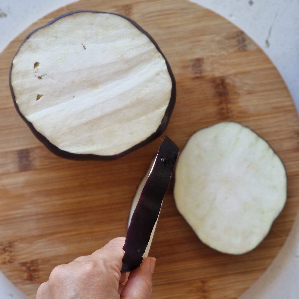 To prepare this recipe, I used rather large round eggplants, the ones with the dark stem.