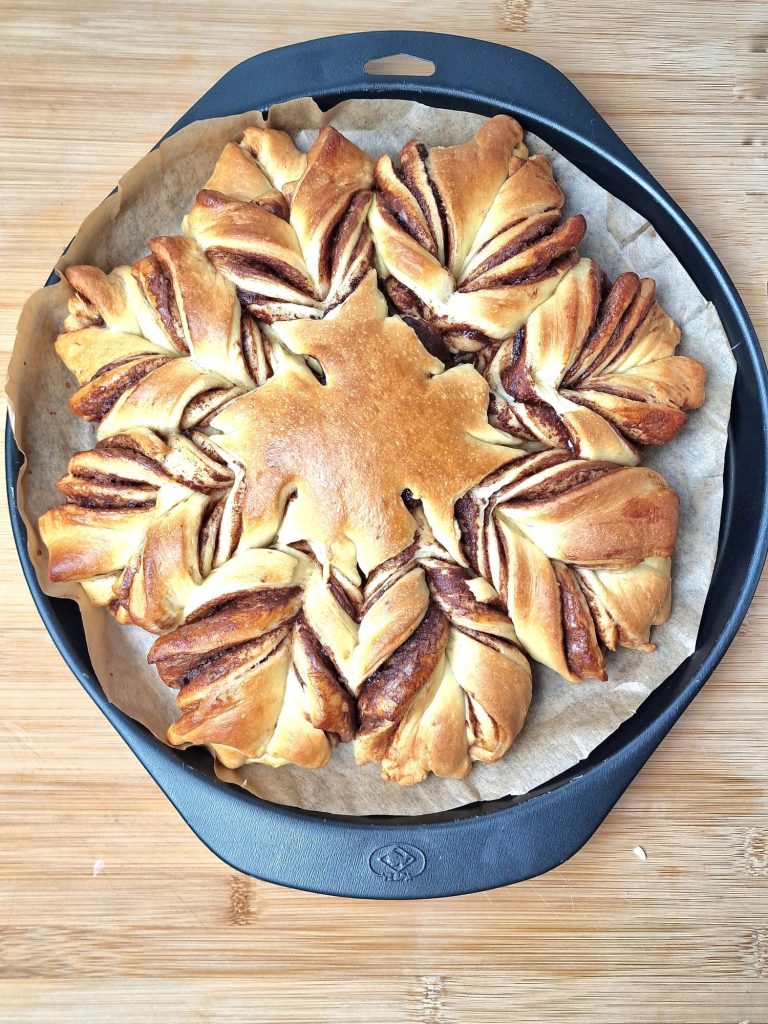 • Take two wedges of dough at a time, twist them outward and join the ends. Once you’ve finished, using the parchment paper, transfer the star onto a baking sheet and let it rise again for about 1 hour.