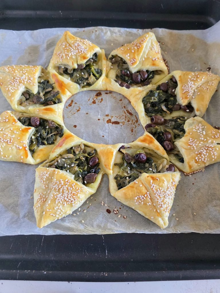 Inspired by the classic and rich Neapolitan escarole pizza (a must for Christmas Eve dinner), this puff pastry star with escarole captures its intense and enveloping flavor, presenting it in an elegant and festive shape.