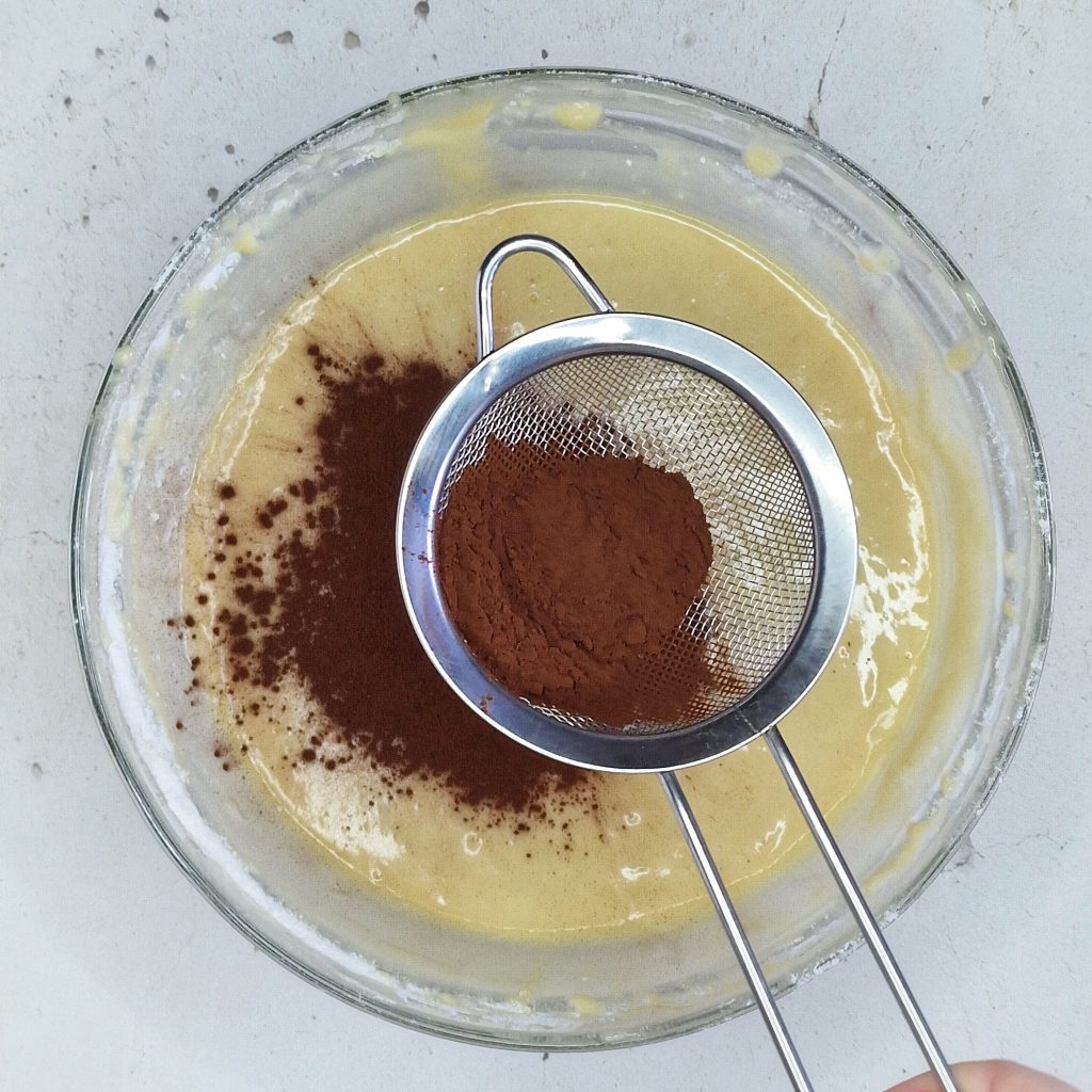 In the meantime, add the sifted cocoa powder to the remaining batter and add 2 tbsps of milk to mix everything well, until you get a homogeneous cocoa mixture.