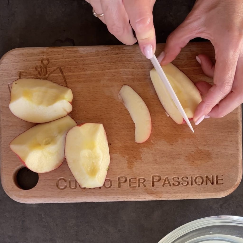 Cut the apple in half, remove the core, and slice it thinly without removing the peel.