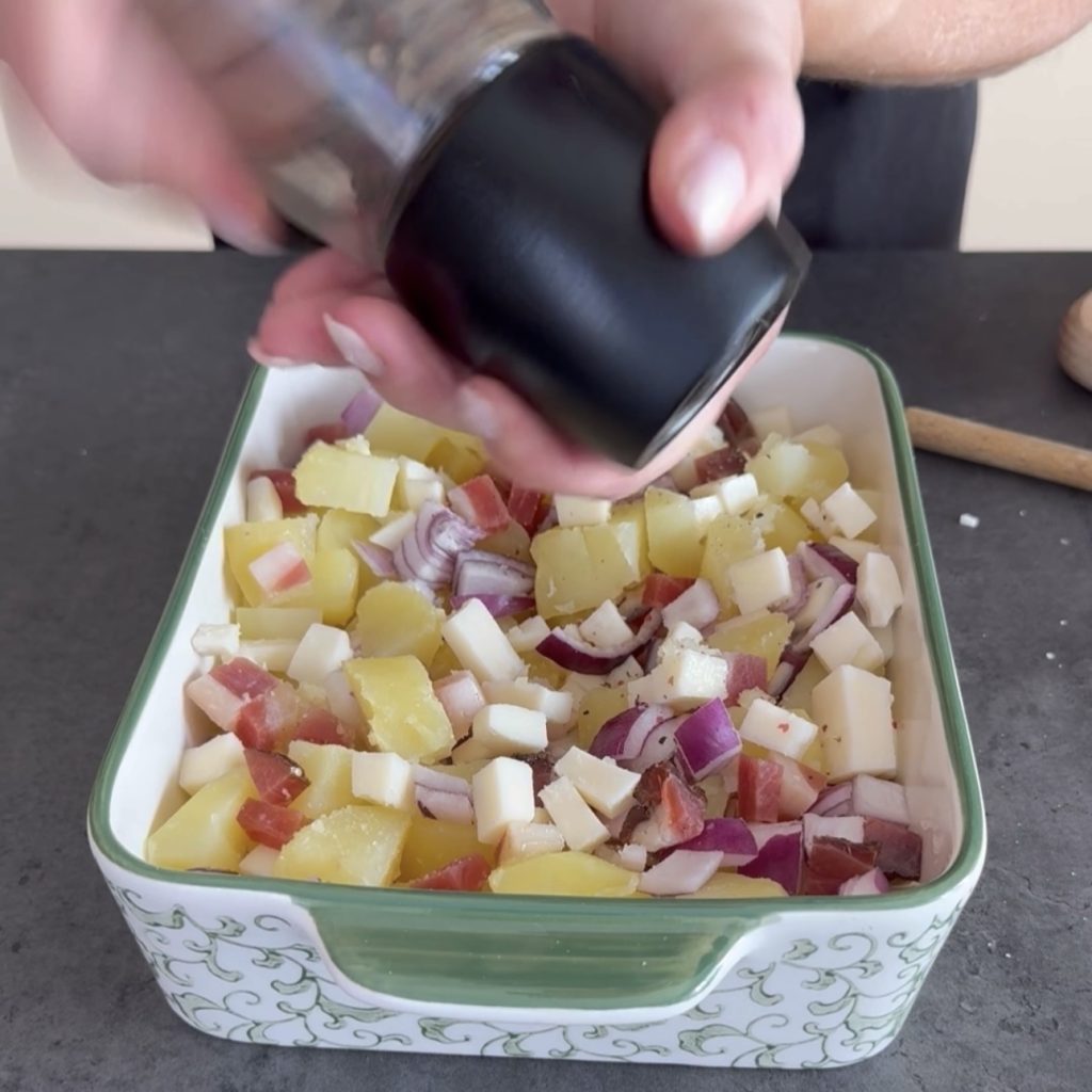 Baked potatoes and speck with onion, a unique dish that’s easy to make and which you’ll recreate many times once you’ve tried it. You can prepare the potatoes with speck and onion either with speck cut into cubes as I did, or with thin slices of speck and then cut into strips, I prefer to taste larger pieces of speck. To the speck potatoes, I also added diced pizza mozzarella, alternatively, you can use smoked cheese like scamorza or provolone or add alpine cheese. Now let’s see how to make baked potatoes and speck, and if you try them let me know. Barbara