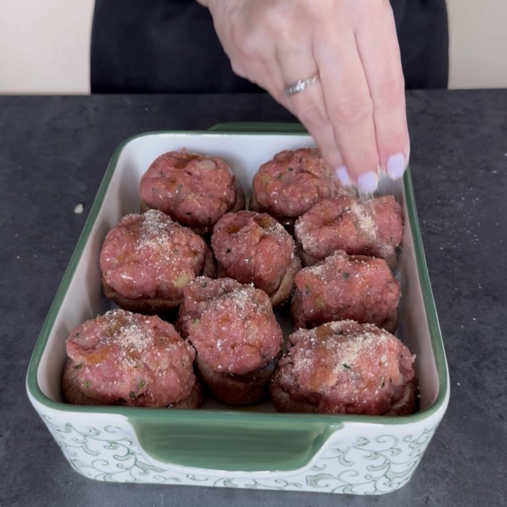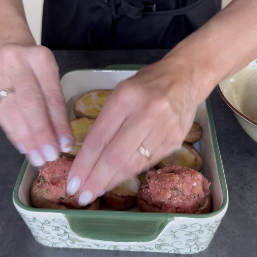 and take some of the mixture to form a meatball, place the meat on each mushroom.