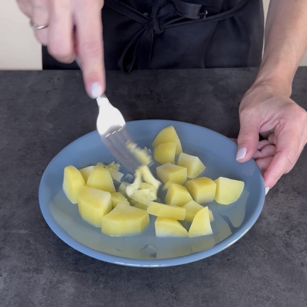 Let’s start preparing the Baked stuffed mushrooms, boil a potato and mash it well with a fork.