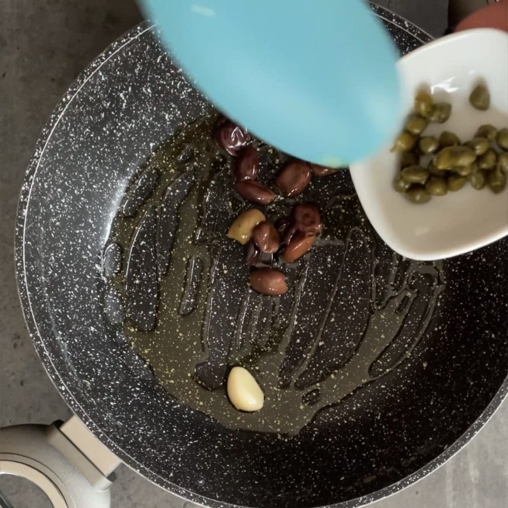 Once cooked, serve the cauliflower in the pan hot, adding the cooking sauce with olives and capers.