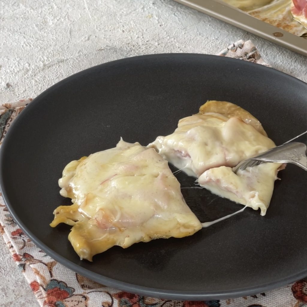 put back in the oven and bake for 5 minutes or until the provolone has melted. Remove the dish from the oven and serve the Chicken breast with cooked ham and provolone hot.