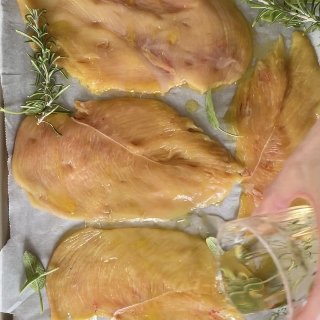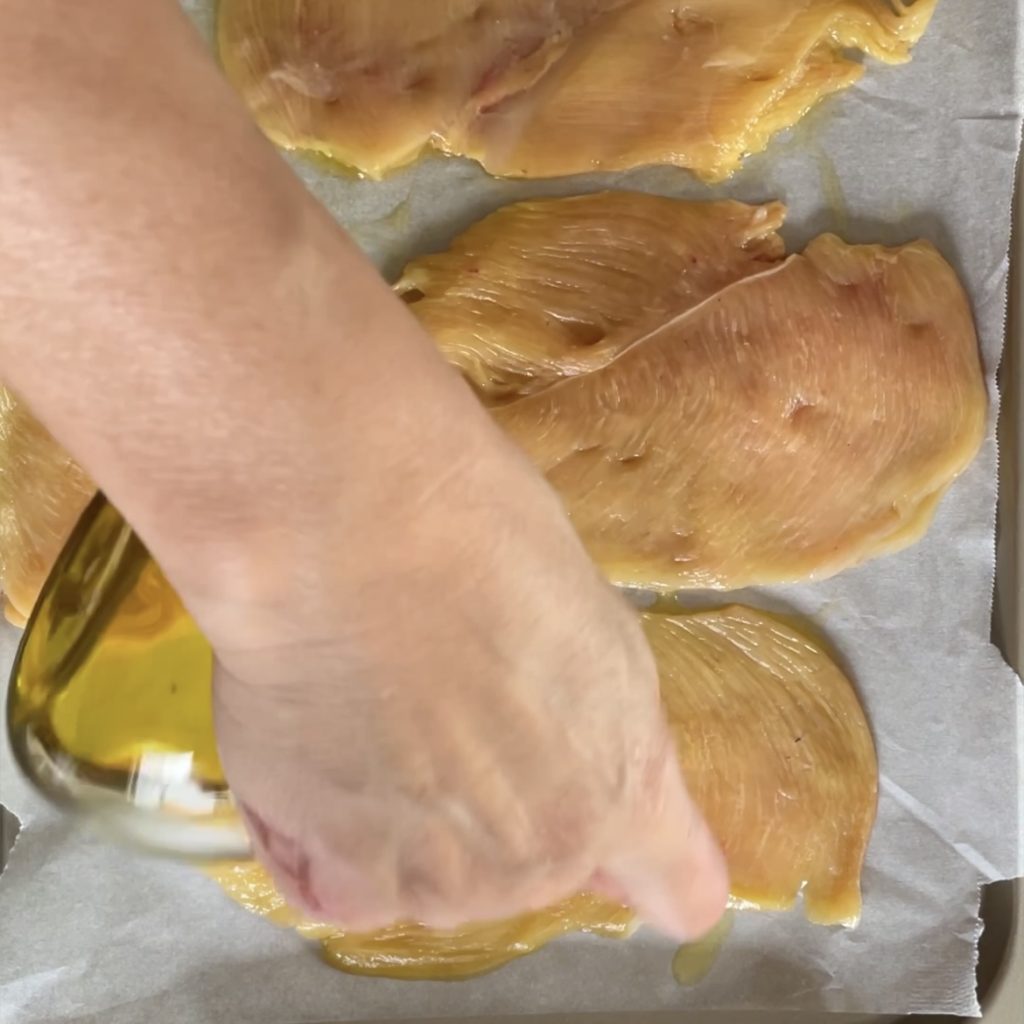 Let’s start preparing the Chicken breast with cooked ham and provolone by lining a baking dish with parchment paper and pouring extra virgin olive oil into it,