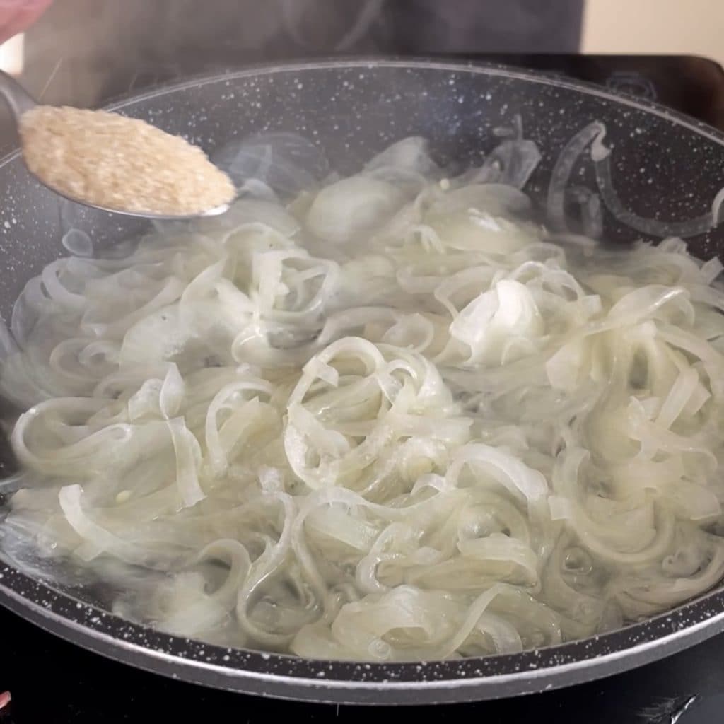 When the onion is soft, add a teaspoon of brown sugar and mix well,