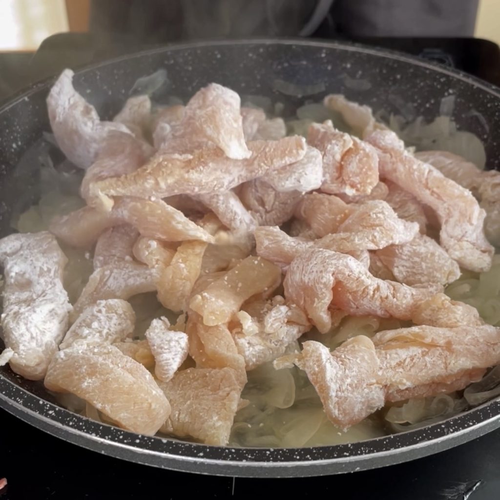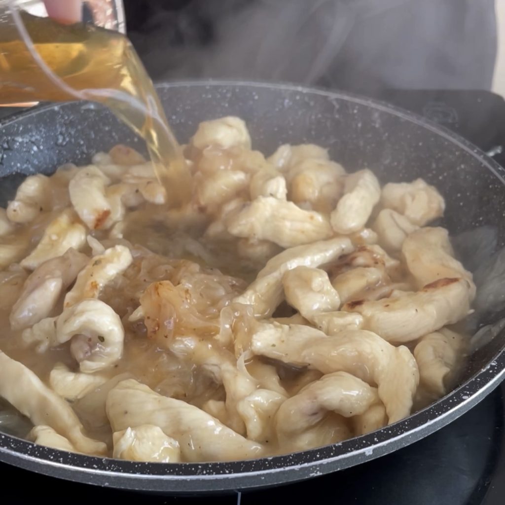 When the chicken strips are browned, add the broth to create a creamy sauce,