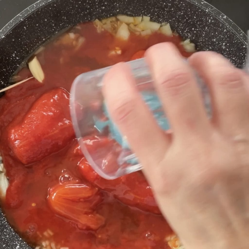 Sauté for a few minutes, then add the peeled tomatoes.