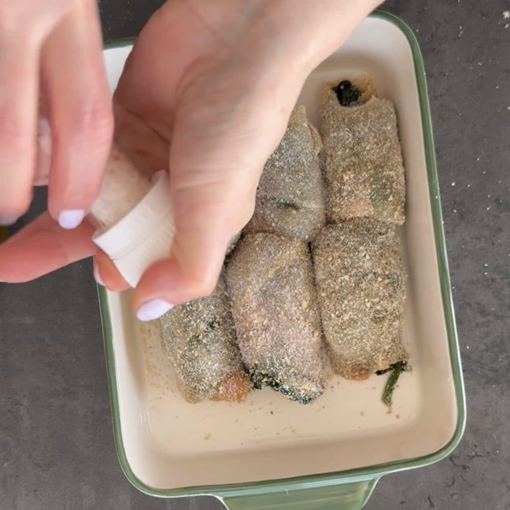 • After preparing the chicken rolls, place them in a tray that fits into your air fryer basket, spray with extra virgin oil, and cook in the air fryer at 375°F for 10 minutes, open the air fryer basket, turn the rolls, and cook again at 375°F for another 5 minutes, open the air fryer basket, remove the tray and serve the rolls hot.