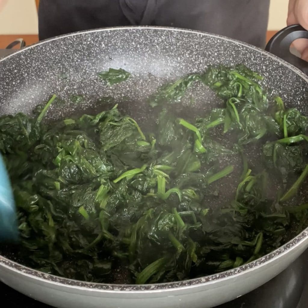 • then remove the lid and continue cooking until all the liquid that has formed has completely evaporated. When the spinach is ready, remove from heat and allow to cool.