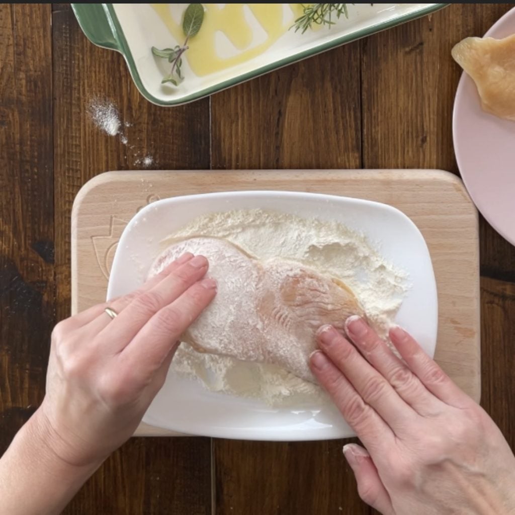 Pour some flour onto a plate and coat the chicken breast slices on both sides, then remove any excess flour.