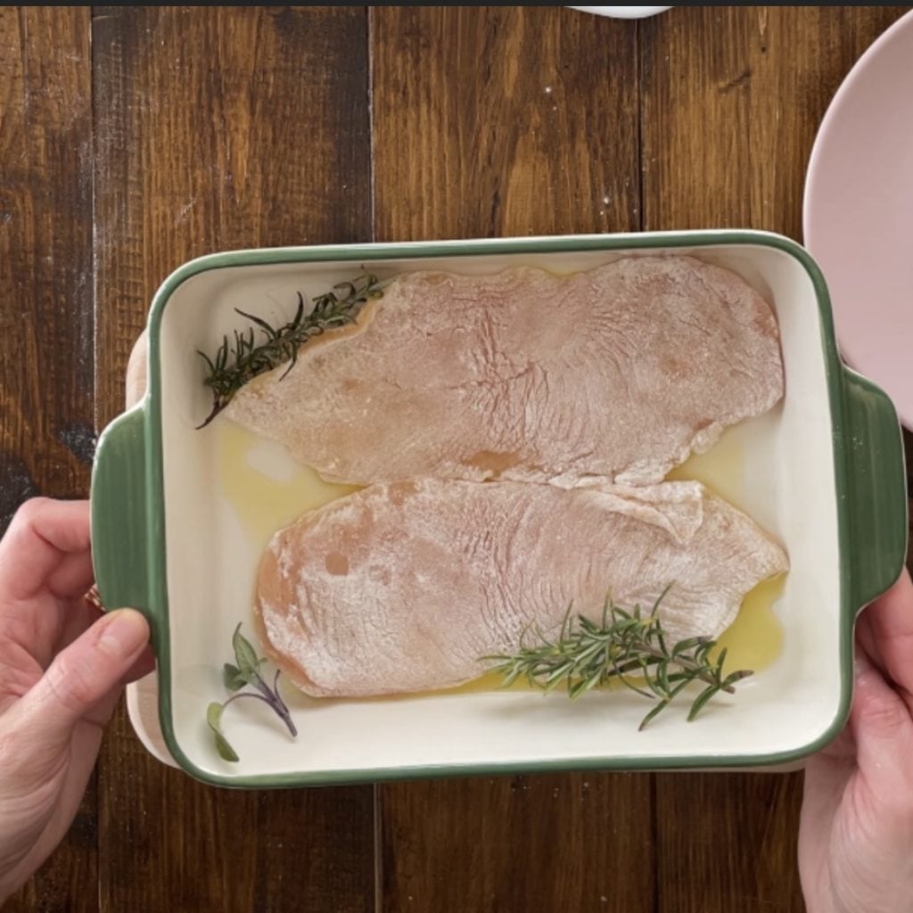Let’s start preparing the Chicken scallopini pizzaiola style, cut the cheese into small pieces, pour some extra virgin olive oil into a baking dish, and add the rosemary and sage.