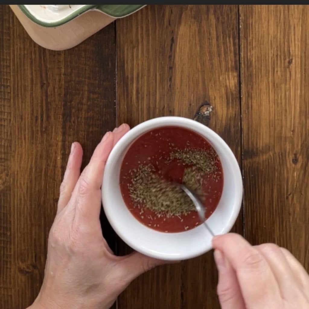 While the chicken slices are in the oven, pour the tomato sauce into a bowl, add some oregano, a dash of extra virgin olive oil, a pinch of salt, and mix well.