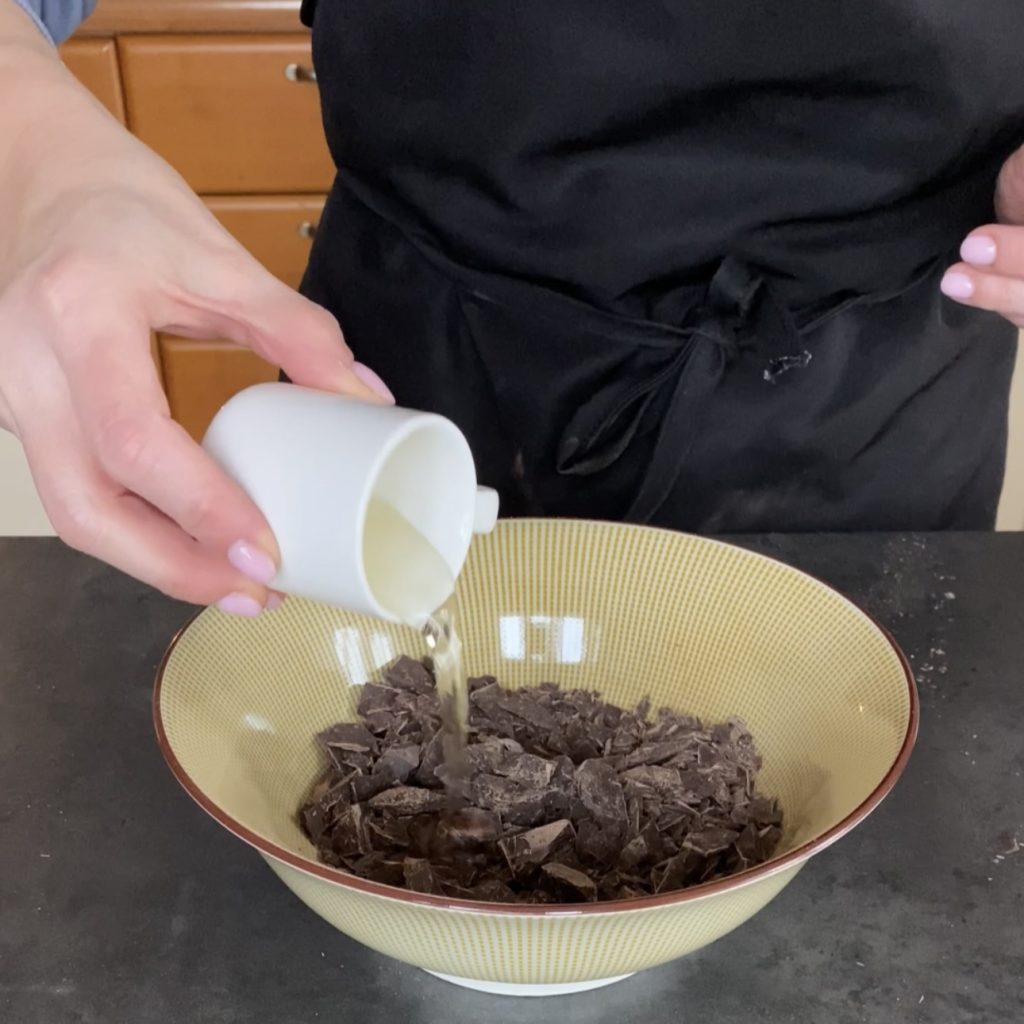 Melt the chocolate in a bain-marie or to speed up, you can put it in the microwave at 750W for 2 minutes. Then take the bowl out of the microwave and mix well with a fork until the chocolate is completely melted.