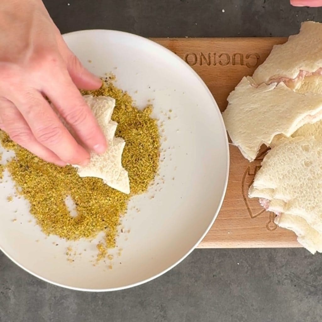 • and dip the sandwiches in the pistachio flour, removing any excess.