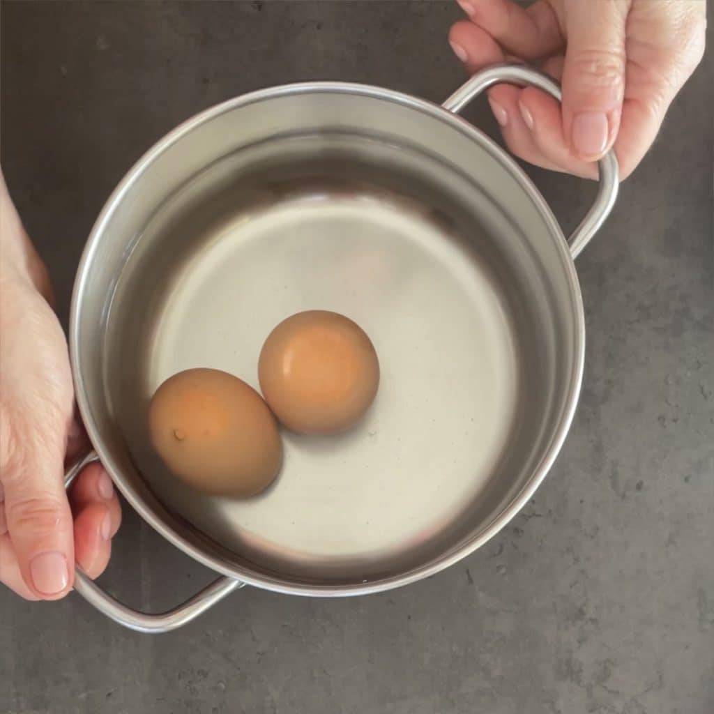 Start preparing the Cold Pasta with Eggs and Tuna by placing the eggs in a pot with water and cooking them for 7 minutes from the moment the water starts to boil. Then remove them from the heat and cool them under very cold running water, this step will make them easy to peel.