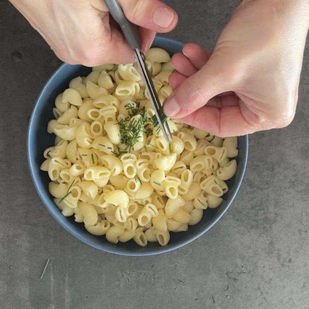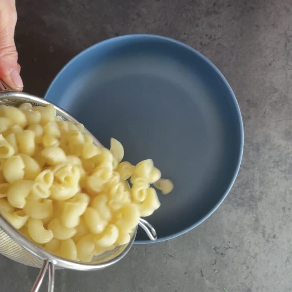 When the pasta is cooked, drain it and cool it under running water or as you prefer, then place it in the bowl.