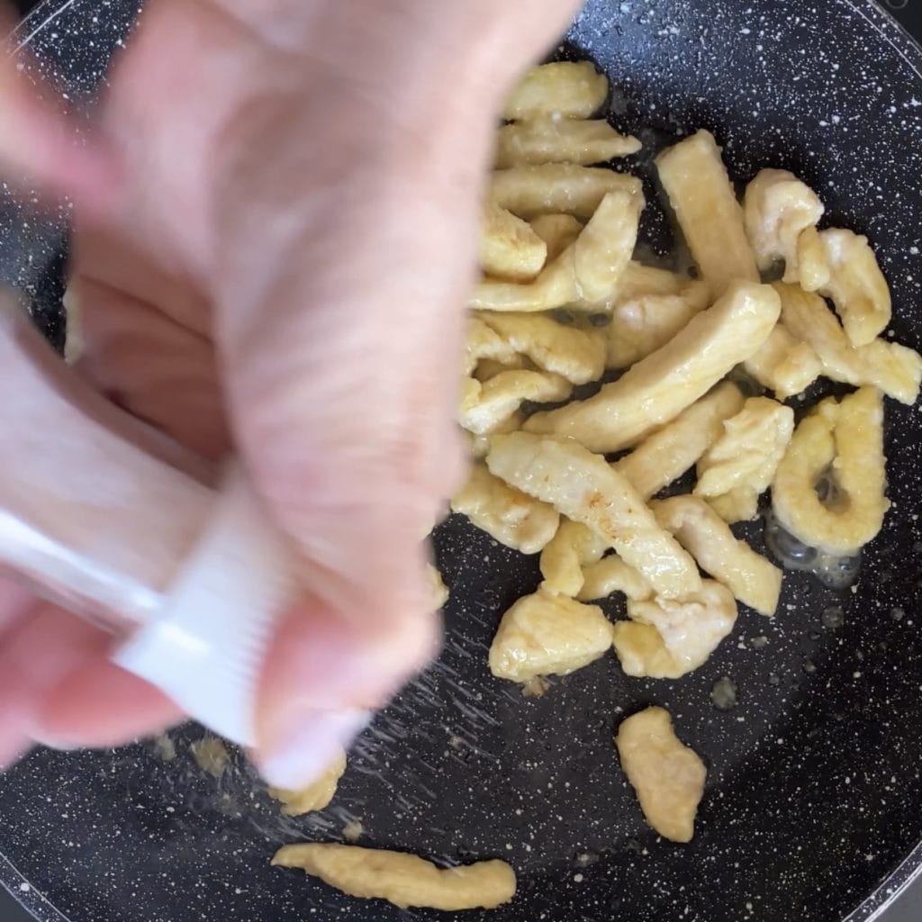 Begin preparing creamy chicken strips in milk sauce by cutting the chicken breast slices into strips,
