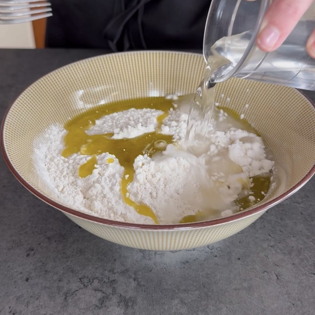 • Let’s start preparing the Crispy Flatbread without Yeast, pour the flour, salt, and extra virgin olive oil into a bowl