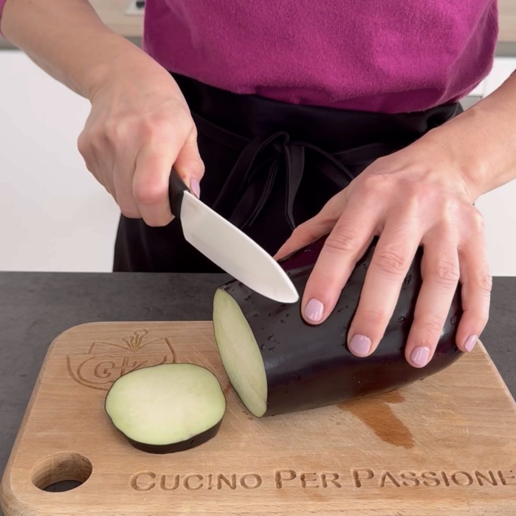 • Let’s start preparing the eggplant cordon bleu in the air fryer, wash the eggplant, trim it, and cut it into slices about half a centimeter thick.