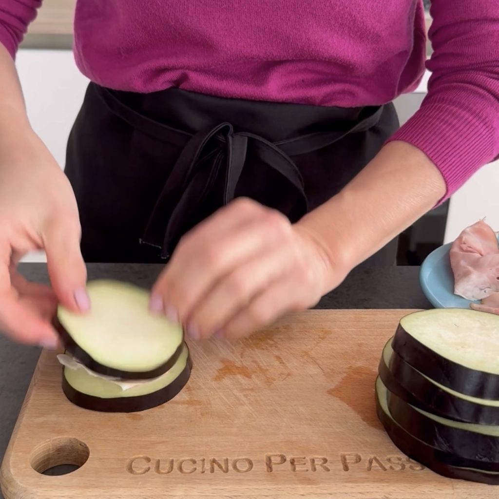 • Take a slice of eggplant, place a slice of cooked ham in the center