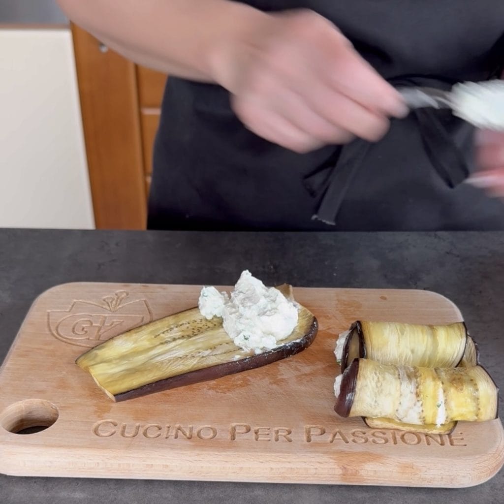 • When the eggplants are ready, take each slice and add a tablespoon of ricotta cream on one side,