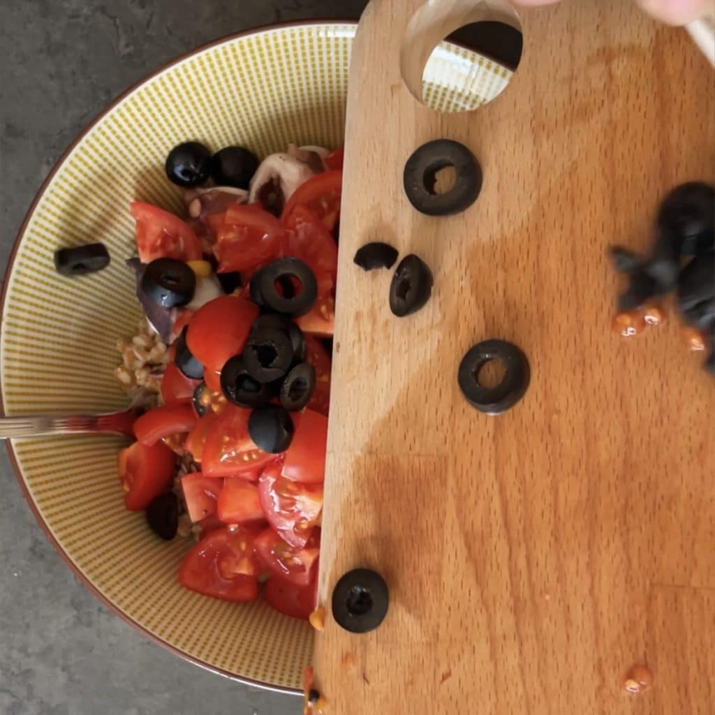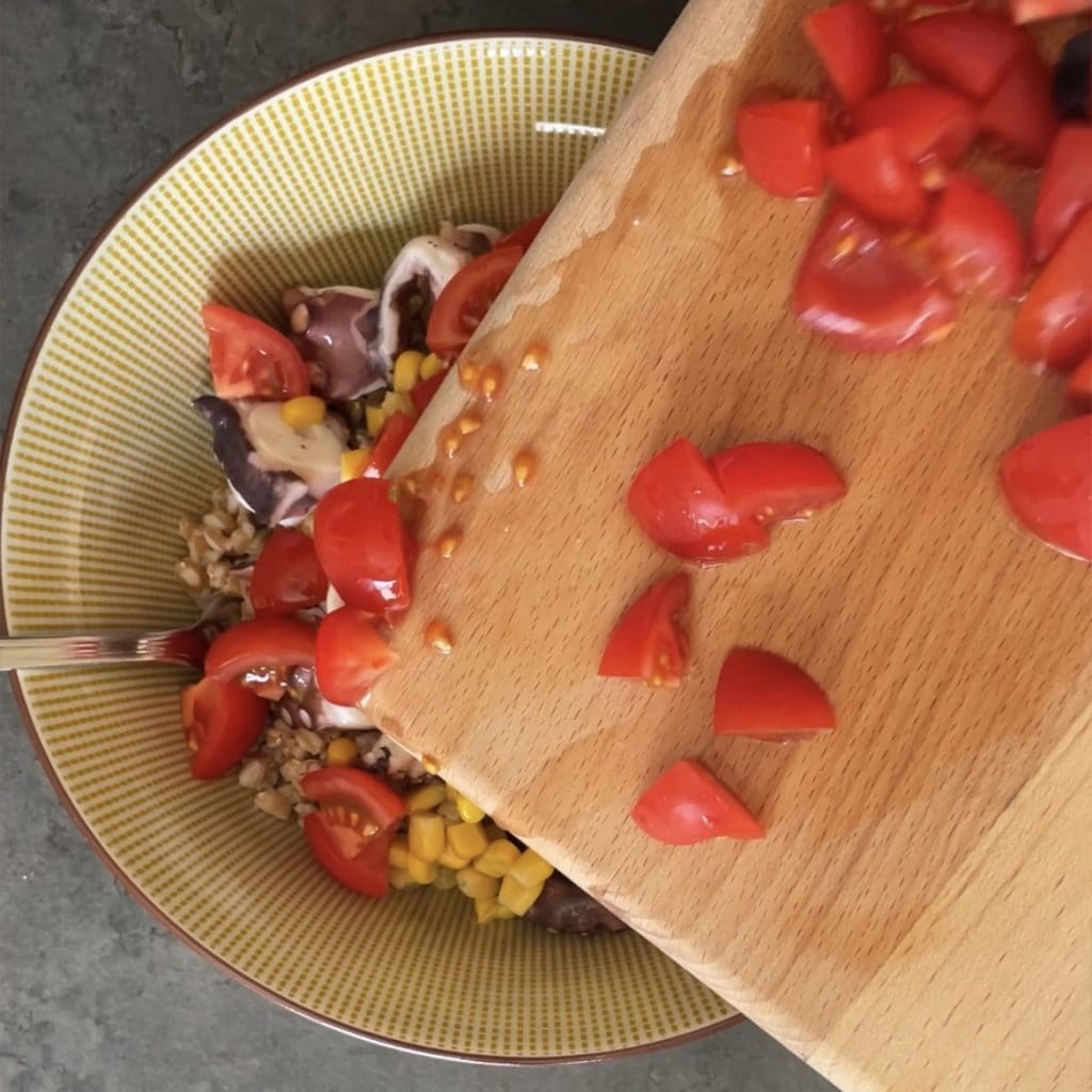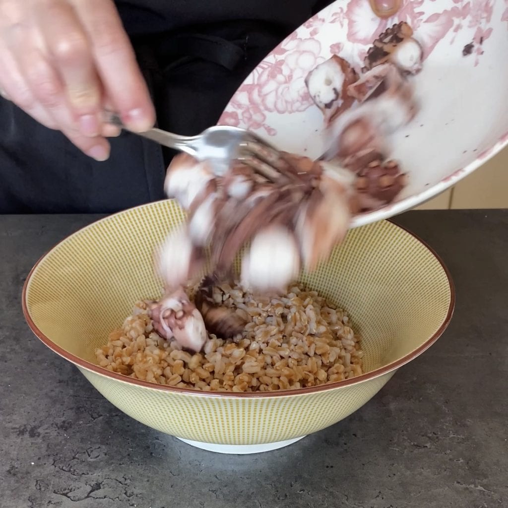 When the farro is ready, pour it into the bowl and add the chopped octopus,