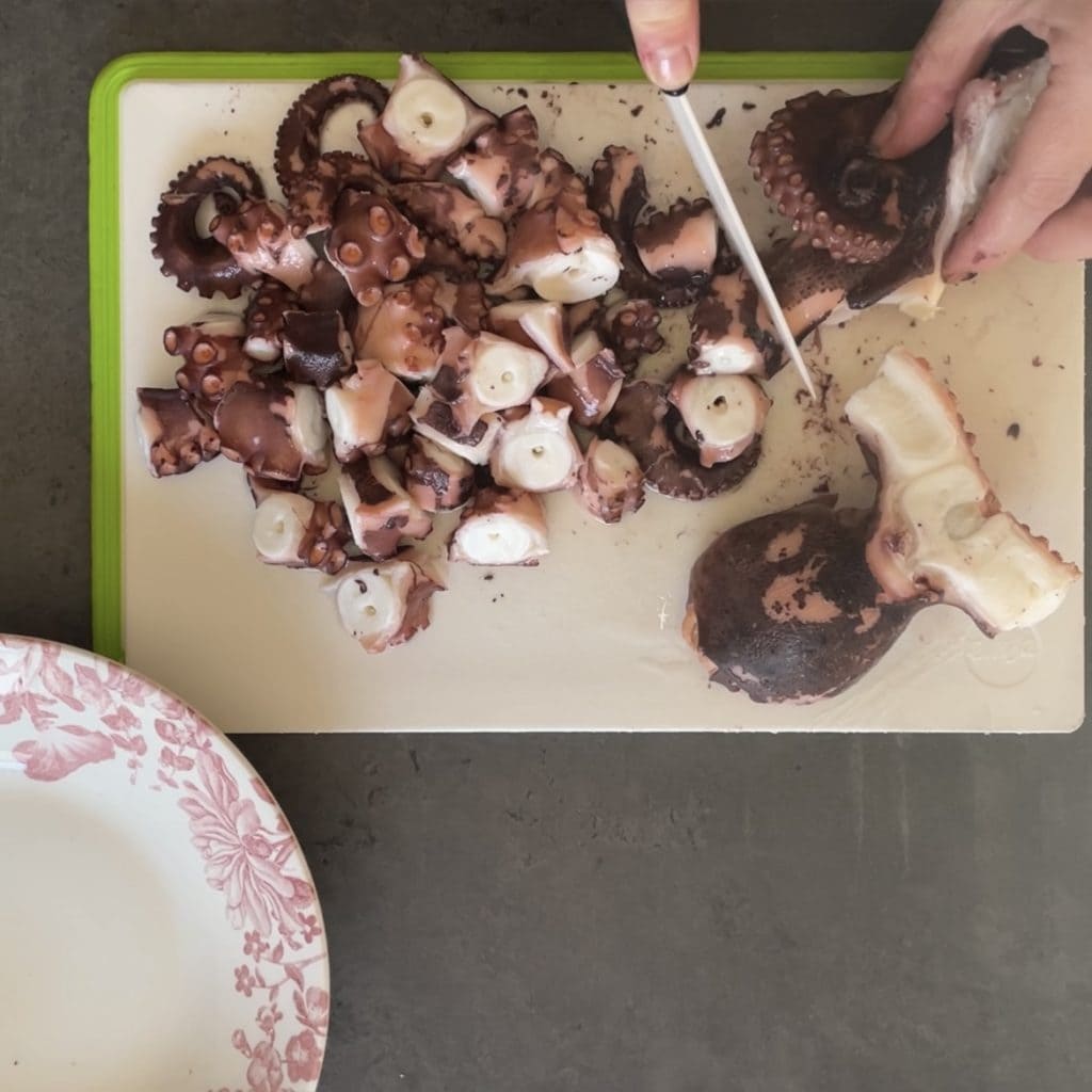 Clean the octopus from the innards, remove the eyes and beak, and wash it very well under running water. Before fully immersing the octopus in the boiling water, to which you will have also added 2 bay leaves, curl the tentacles by raising and lowering the octopus several times, holding it by the body. When the tentacles have curled, fully immerse it in the boiling water and cook it in salted boiling water for about 40 minutes; the time may vary depending on the octopus. Check the cooking by inserting a fork; if it goes in easily, it’s cooked.