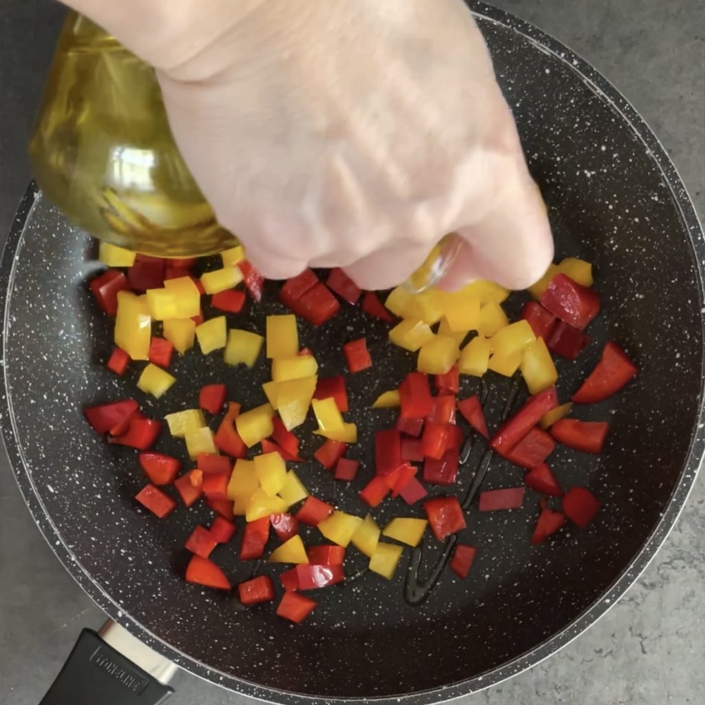 Let’s start preparing the frittata with bell peppers. Clean the peppers by removing the seeds and internal filaments, wash them well, and cut them into small pieces.