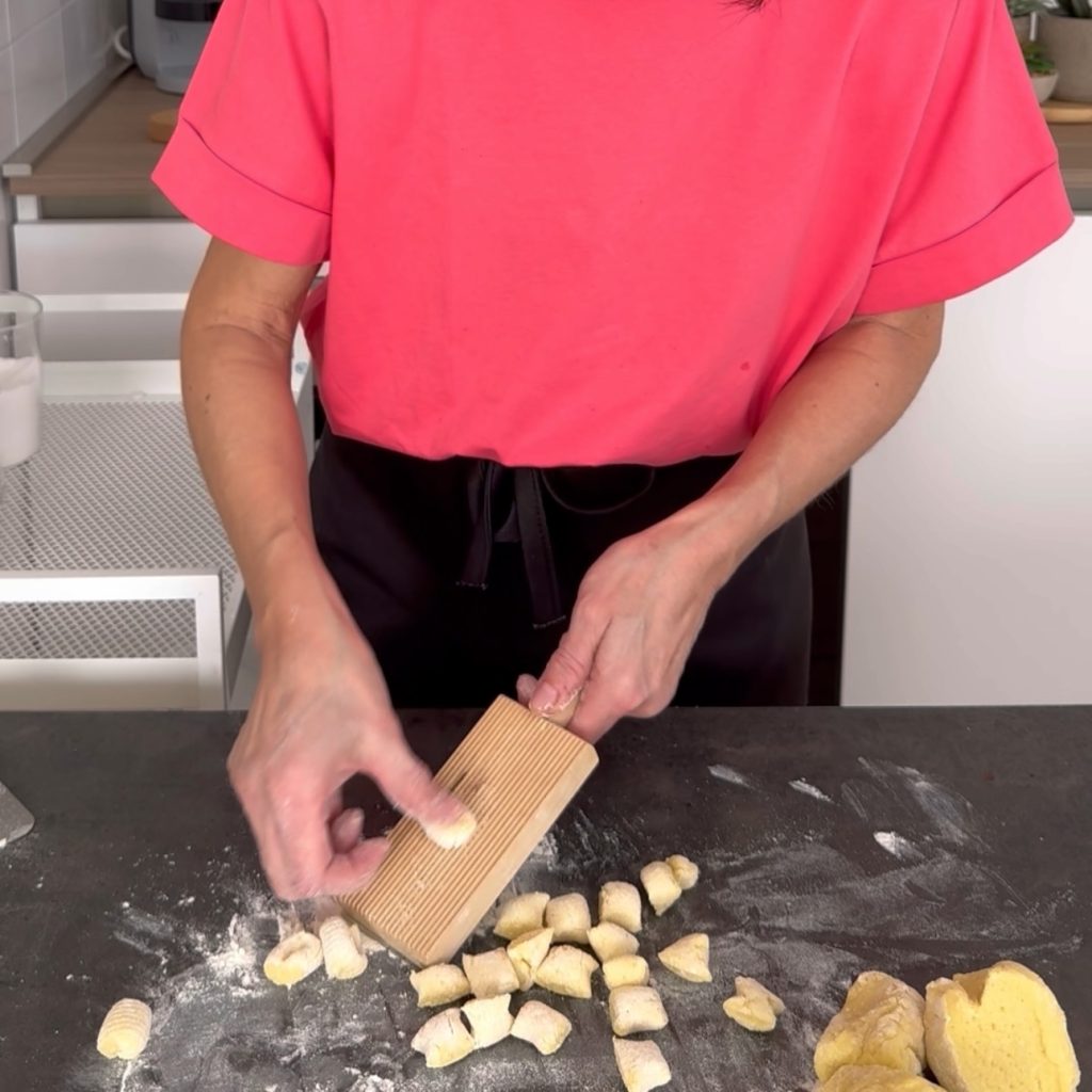 and pass them on the specific tool to create grooves, or roll them on the tines of a fork or the back of a grater.